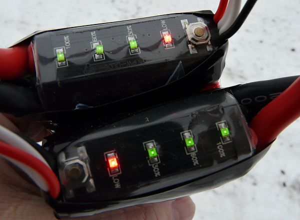 Model, který jsme testovali, měl doporučenou výbavu od firmy Pelikán, motor s vrtulí APC 14x8"E i regulátor byl značky FOXY, stejně tak externí BEC. Serva byla HS-225MG. K ovládání jsme použili zcela novou RC soupravu firmy Multiplex a to konkrétně vysílač Cockpit SX9 s devítikanálový telemetrický přijímač RX-9-DR M-LINK vybavený stabilizačním systémem. Ten byl však pro první, zalétávací lety deaktivován. Test nového vysílače, stejně tak přijímače se stabilizačním systémem uvedeme v některém z příštích čísel. Pohonný akumulátor byl šestičlánek FOXY složený ze dvou tříčlánků o kapacitě 3700mAh. Zajímavostí uvedených baterií je zabudovaný indikátor nabití (viz. obrázek). Je to příjemné stačí zmáčknout tlačítko a rázem zjistíte, zda máte v ruce nabité baterie. Model byl vybaven pouze servy pro řízení všech kormidel a nebylo osazeno ovládání vlečného háčku a pumovnice, což jde dodělat dodatečně. Stejně tak nebyl vybaven LED osvětlením, pouze jsme protáhli vodiče, aby osvětlení mohlo být v případě potřeby doinstalováno. Takto vybavený model měl vzletovou hmotnost 2905 gramů, což je o 55 gramů více než uvádí výrobce. Je to dáno použitou pohonnou baterií, jež měla o cca 400mAh víc než doporučuje návod. Doba letu se v této konfiguraci pohybovala kolem 10 minut při kombinaci 3D akrobacie a klidných průletů na břiše i na zádech.