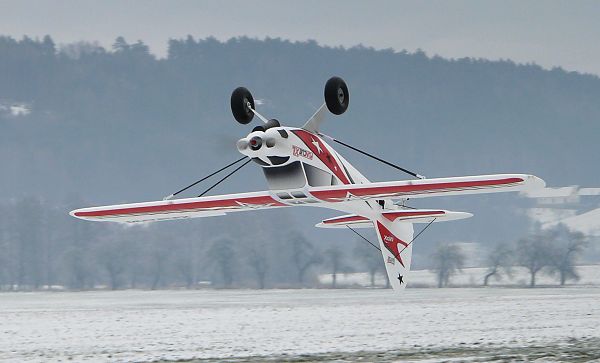 Nyní k samotnému záletu, ten proběhl na začátku ledna za nepříliš vhodného počasí. Za teploty kolem 0 stupňů Celsia a zatažené oblohy. Nevýhodou byl i sněhový poprašek, takže vše působilo bílým dojmem a tak bílý EPP model nebyl moc, na větší vzdálenosti, vidět. Ještě že jsme jej polepili dodanými červenými samolepkami. Výhodou bylo, že prakticky nefoukal vítr. Pilotáže se ujal, jako vždy, můj syn Marek. Hned při startu bylo zřejmé, že výkonu je dost, start je bez problémů možný tak na půl plynu. S lehce vytaženými klapkami možná ještě méně. Marek nastoupal do výšky kolem 50 metrů a lehce dotrimoval všechna kormidla. Pak začal testovat reakci modelu na vztlakové – brzdící klapky, konstatoval, že pro větší pohodu to chce namixovat klapky do výškovky, aby pilot nemusel při vysunutých klapkách tlačit. To je vcelku normální jev. Nicméně pokračoval v dalším letu. FunCub XL se jeví jako stabilní stroj ale díky kratšímu trupu, oproti rozpětí, je schopen i 3D obratů. Jen směrovka, resp. její výchylky by mohli být větší. Hlavně je to vidět na kopaných výkrutech a při visení, čehož je i tento cvičný hornoplošník, schopen. Model je trošku rychlejší než jsem očekával a při plně vytažených klapkách, na téměř 90 stupňů, sice hodně zpomalí, ale je pak méně klidný a na jeho pilotáž si musí pilot trochu zvykat. Uvidíme, co s tím udělá stabilizační systém, který budeme dále testovat. Je to dáno tím poměrem délky trupu a rozpětí křídel. Ovladatelnost modelu křidélky je výborná a model poměrně rychle výkrutuje, je samozřejmé, že to nejsou úplně rovné výkruty jako u plnokrevného akrobata, to se od hornoplošníku nedá ani očekávat. Chování na zádech je dobré není ani třeba příliš mnoho tlačit a to přesto, že má model nesymetrický profil s téměř rovnou spodní stranou. Marek vyzkoušel i výkruty do kruhu. Na nich byla vidět lehce menší účinnost směrovky, avšak vypadaly velmi slušně. Musím upozornit, že tento model na takové 3D obraty není primárně určen a pro běžné létání naprosto vyhoví. Obraty jako přemet, souvrat, normální výkrut a jejich kombinace, zvládá velmi dobře a příjemně drží stopu. Je příjemně rychlý, takže nebude rozhodně hříčkou větru. Doporučil bych jej pilotům, kteří zvládli řízení modelu křidélky a chtějí si vychutnat plně mechanizovaný model s ovládáním vztlakových a brzdících klapek. Pro nezmary, kteří potřebují létat v podvečer, nebo za ztížených podmínek co se týče viditelnosti, je i výborná možnost zástavby pozičních a přistávacích světel. Dále pak možnost vlekání větroňů a vynášení menších parašutistů, či jiného užitečného nákladu, s následným shozem, dělá s FunCuba XL velmi universální model. Další užitečnou možností je fakt, že lze dokoupit i plováky a s modelem létat i z vodní hladiny.